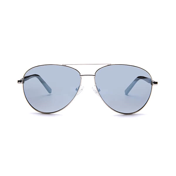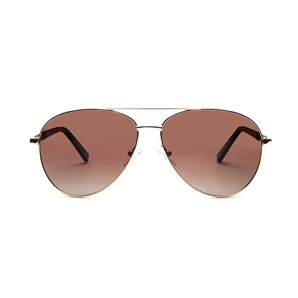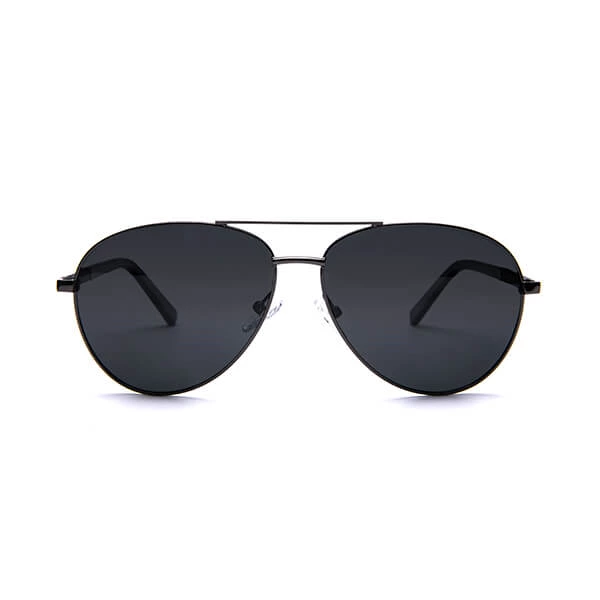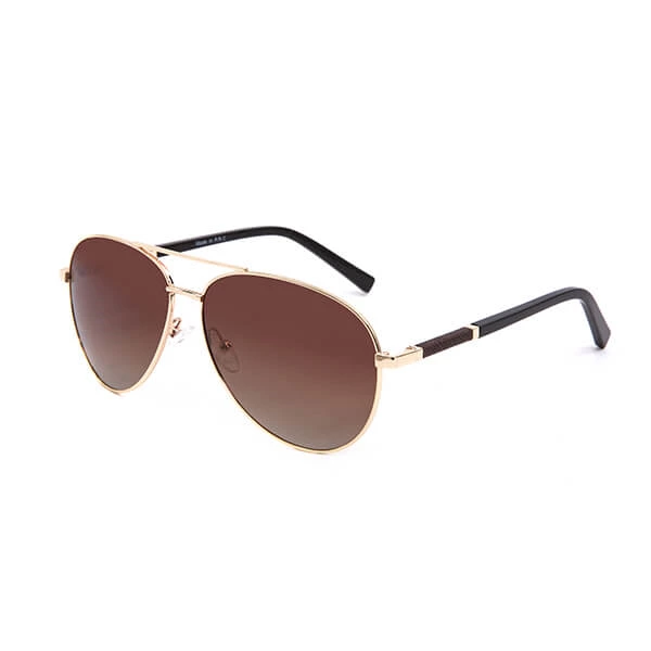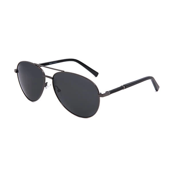 These unisex sunglasses feature a classic aviator metal frame with a sleek double-bridge and temples adorned with PU and long plastic temple tips, adjustable nose pads, and classic polarized lenses.